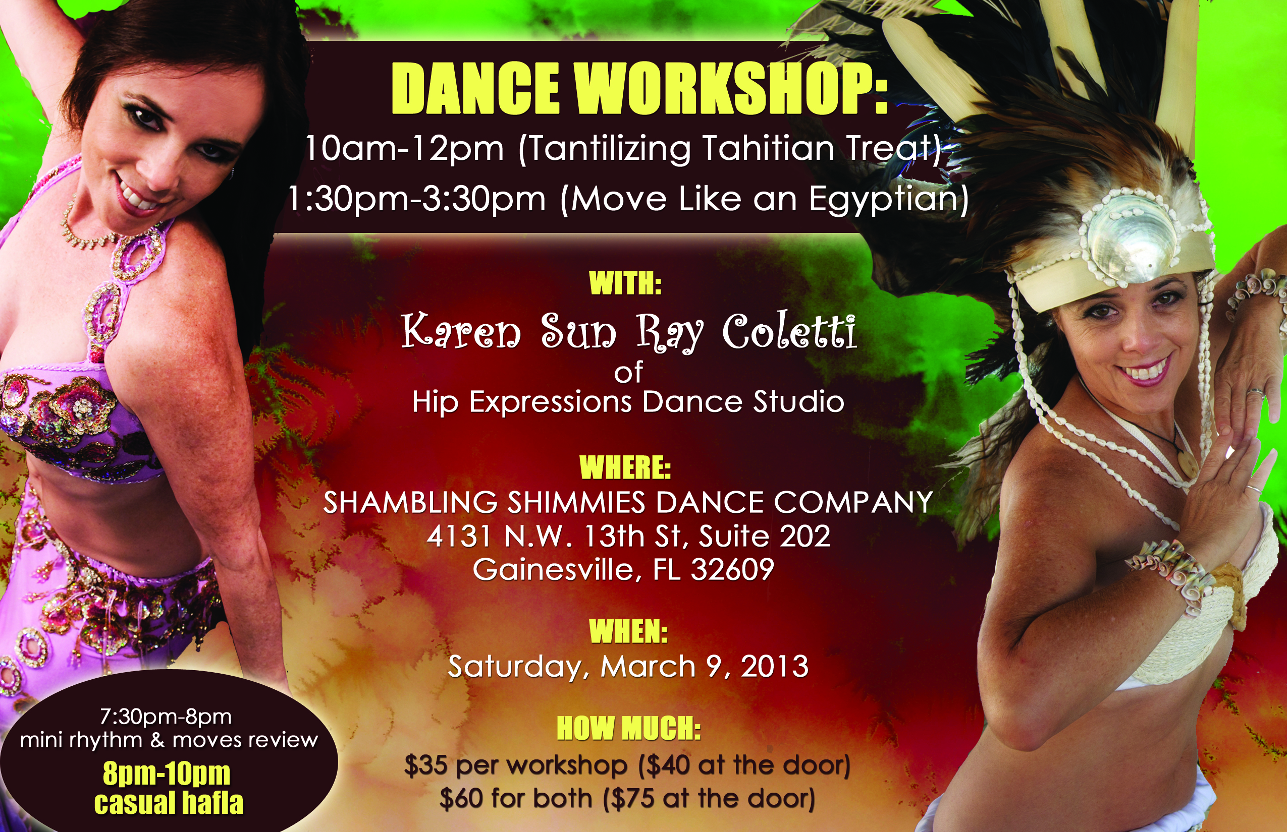 Each day had one workshop focused on folk dances and one focused on an oriental choreography. Â This was nice to keep the brain from being overwhelmed with two much information on one subject. Â I loved both classes!